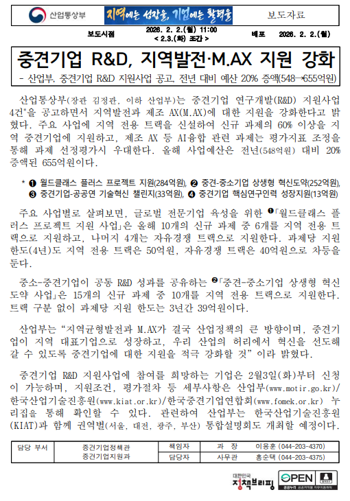 - 020203조간중견기업지원과, 중견기업 RD, 지역발전·M.AX 지원 강화.pdf (273.6K) 0회 다운로드 | DATE : 2026-02-03 09:43:29